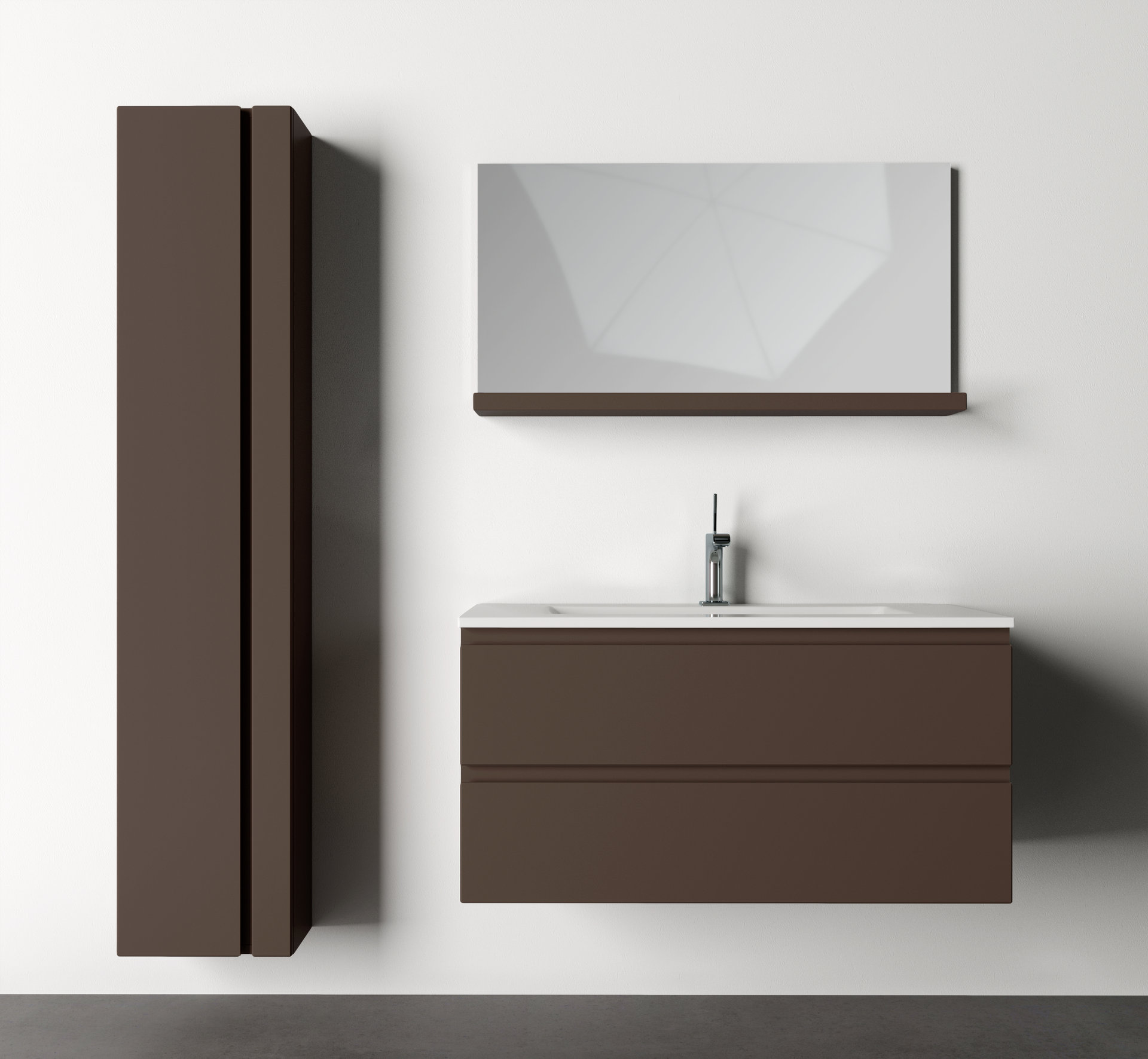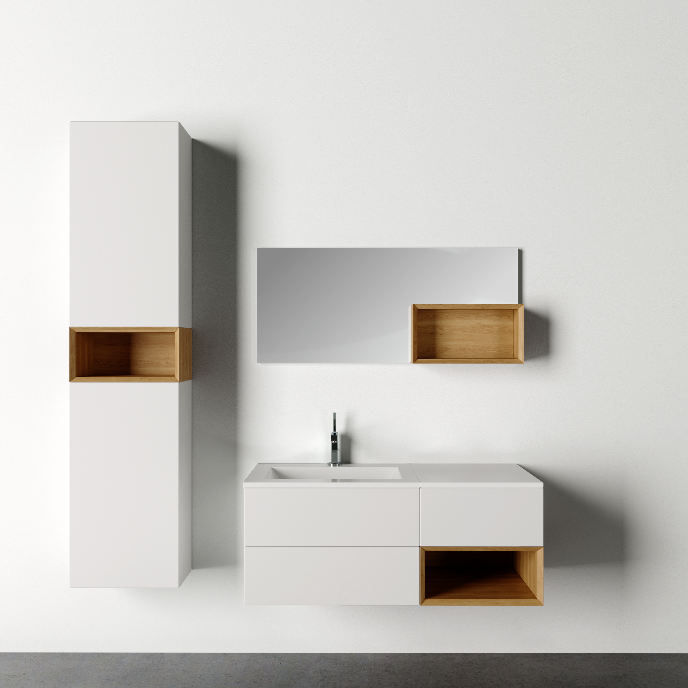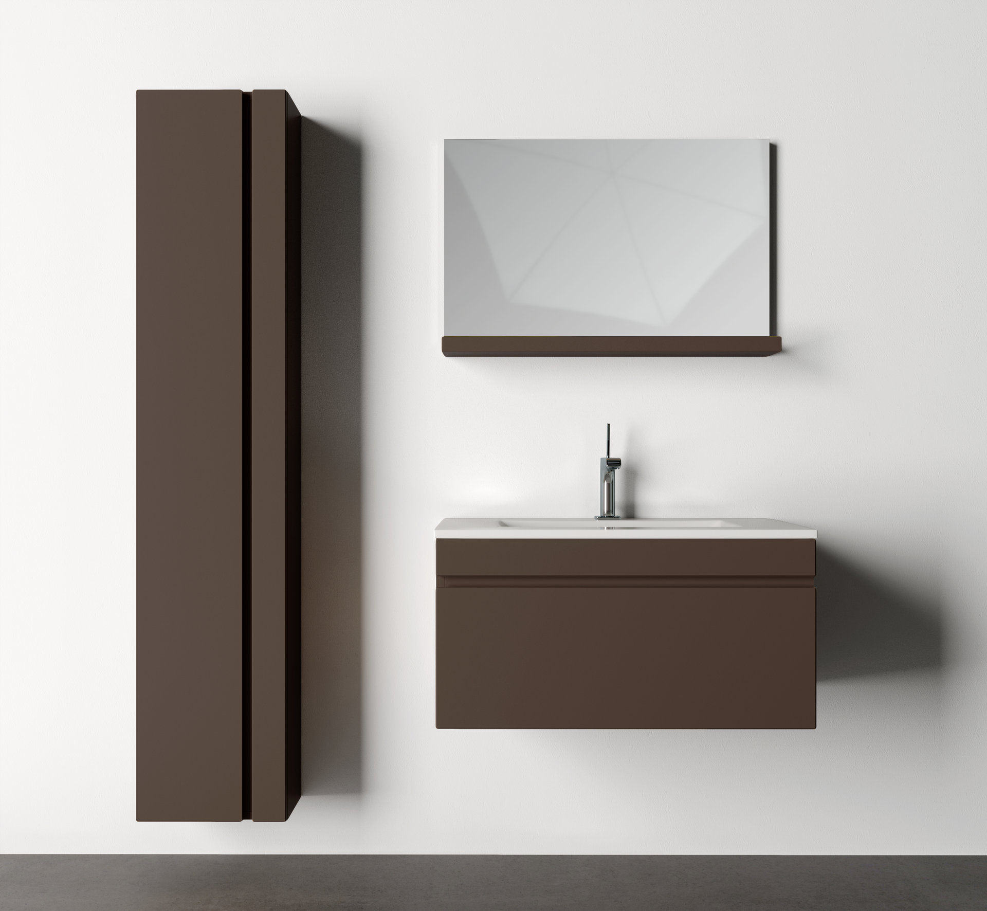 Colecția este disponibilă în trei nuanțe. Mobilierul este compus din bază stativă cu blat corian, oglindă și dulap.