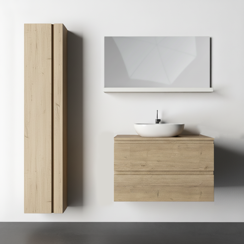 Detaliile de execuție și materialele folosite sunt în măsură să satisfacă exigențele celor mai pretențioși utilizatori. Colecția este disponibilă în două nuanțe. Mobilierul este compus din bază suspendată, blat, oglindă și dulap.