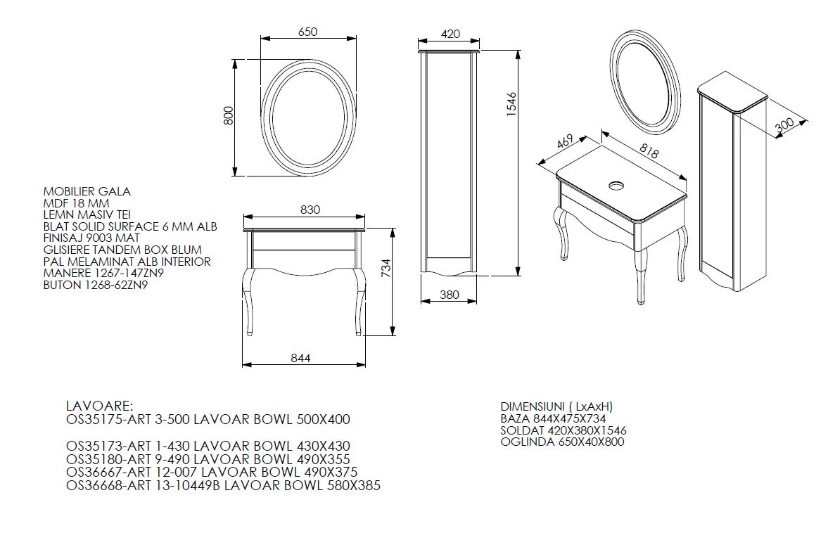 Mobilie baie colectia Gala de la Dalet. Caracteristici: - carcasa si fronturi din MDF vopsit - picioare din lemn masiv de tei vopsit - blat solid surface 6 mm - interior din PAL melaminat - inchideri cu amortizoare - manere aplicate.