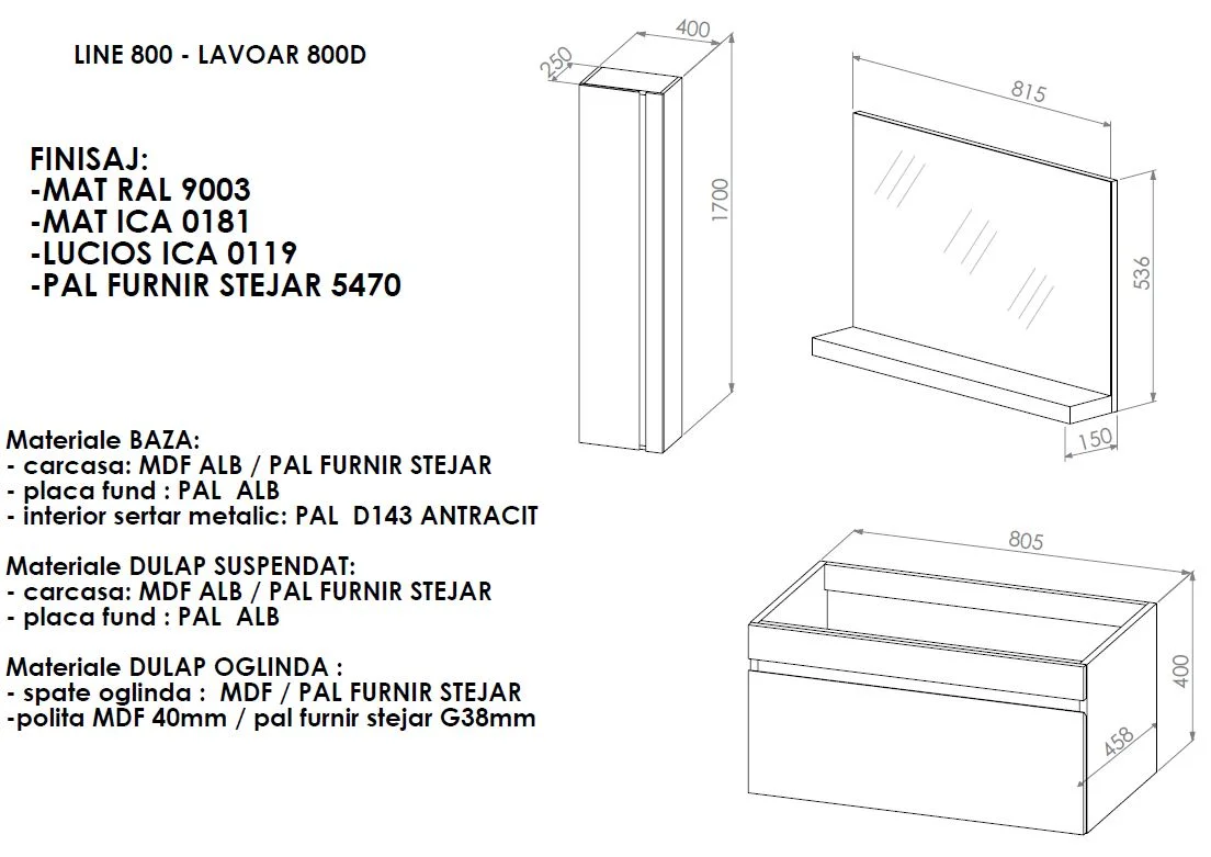 O colecție sobră, masculină, cu trăsături puternice datorită liniilor concrete și proporțiilor alungite. Această colecție oferă avantajul unei combinări ușoare și facile cu celelalte elemente din baie. Simplitatea acesteia este un punct în plus, fiind atractivă atât prin design cât și prin ușurința în utilizare. Un mobilier ce se adaptează perfect dimensiunilor băii și se integrează armonios în ambientul creat. Caracteristici: - carcase, fronturi și polițâ din MDF vopsit - interioare din PAL melaminat - balamale/glisiere cu amortizoare - mânere tip GOLA și fronturi decupate.